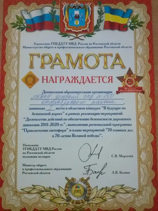 В рамках реализации мероприятий «Десятилетия действий по обеспечению безопасности дорожного движения 2011-2012 г», выполнения региональной программы «Приключения светофора» и плана мероприятий «70 главных дел к 70 – летию Великой победы», МБДОУ № 150 Октябрьского района, занял первое место в областном конкурсе « В будущее по безопасной дороге». Коллектив педагогов представил свою конкурсную работу с участием команд ЮПИД на лучшую акцию в дошкольной организации «Безопасная весна на дорогах города!».