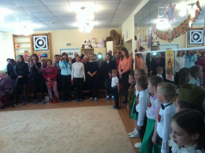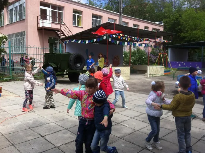 В этом году в преддверии праздника, ребята старших групп готовили подарки для ветеранов своими руками. Разучивали песни военных лет, знакомились с героическим прошлым нашей великой страны. Кульминацией проделанной работы стал праздничный концерт. Затем ребята ходили вместе с родителями возлагать цветы к памятнику «Неизвестного солдата». Но на этом праздник не закончился, на территории нашего детского сада детей и родителей ждала полевая кухня. Ребята из старшей логопедической группы № 5 «Румяные щечки» услышав «Вальс в миноре» в исполнении Кристины Орбакайте, не удержались и стали танцевать вальс.
